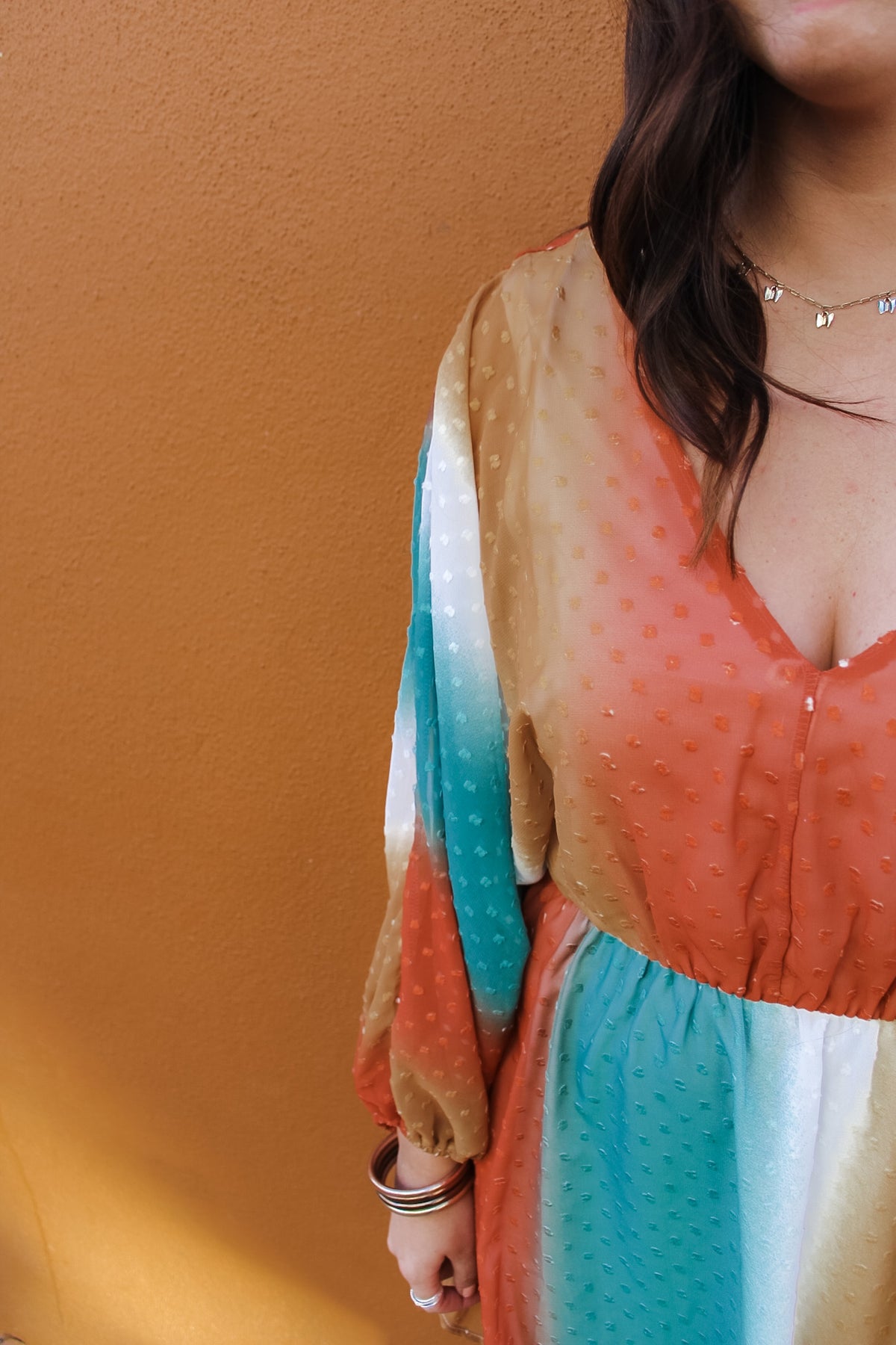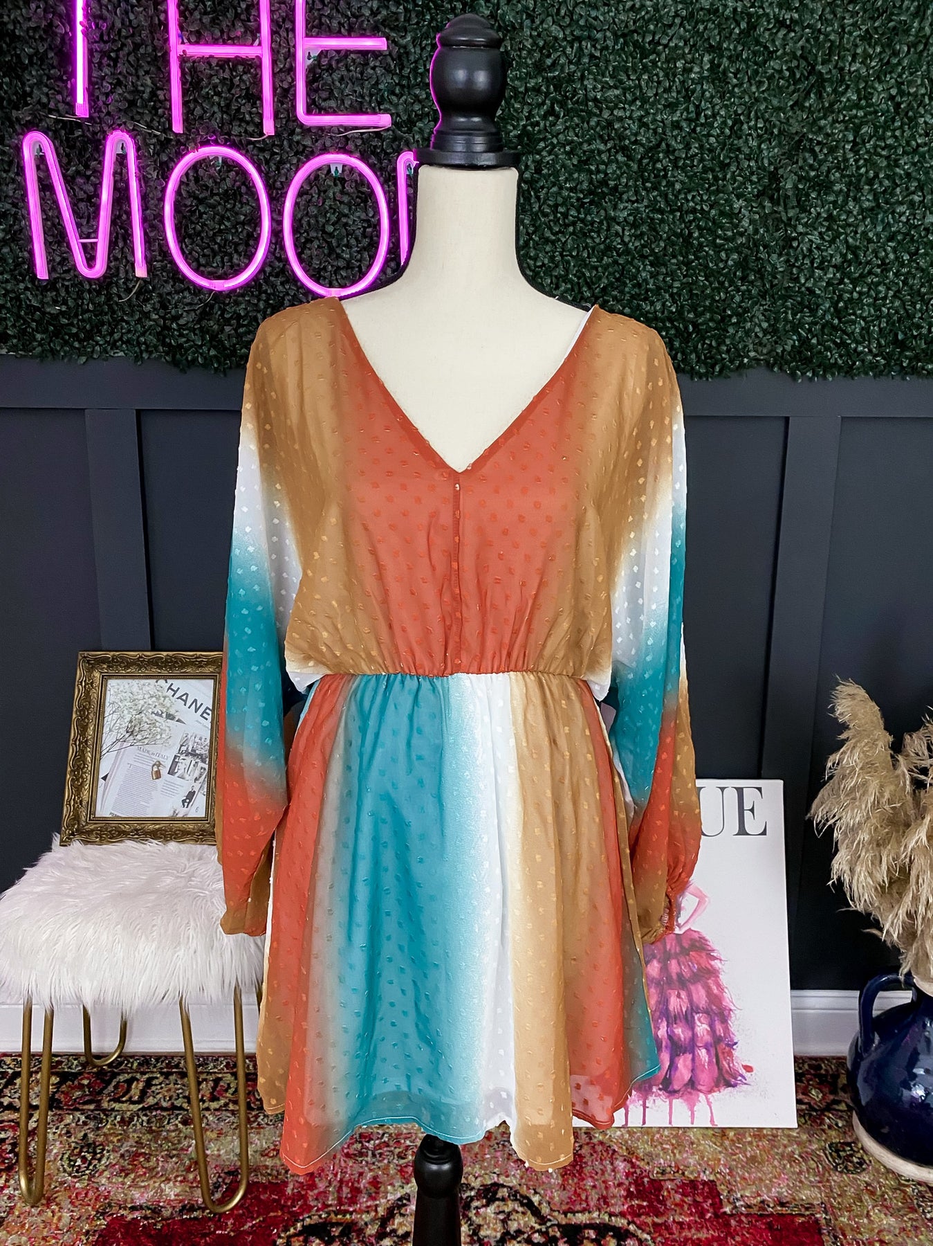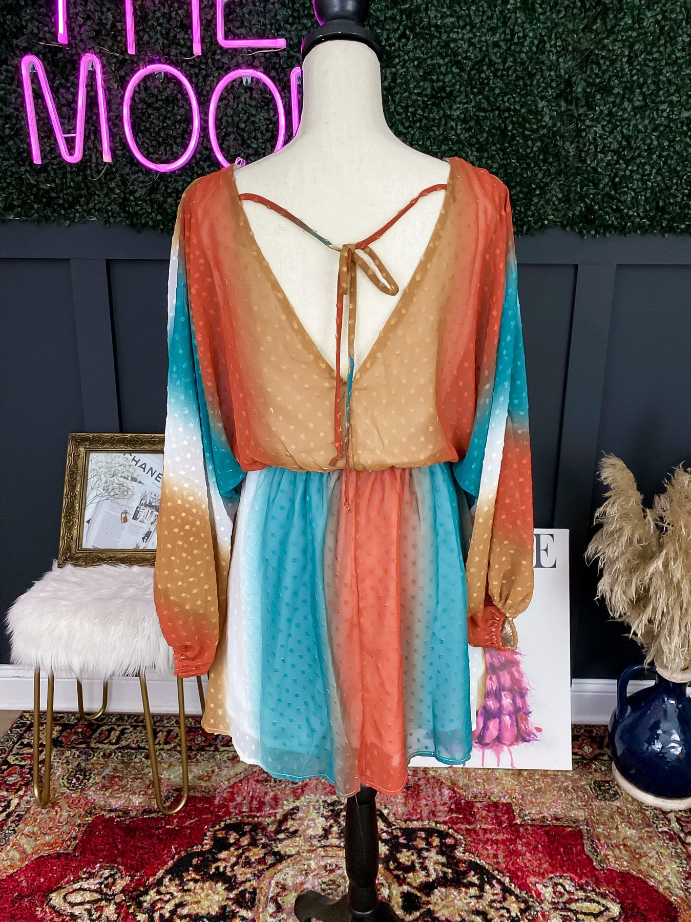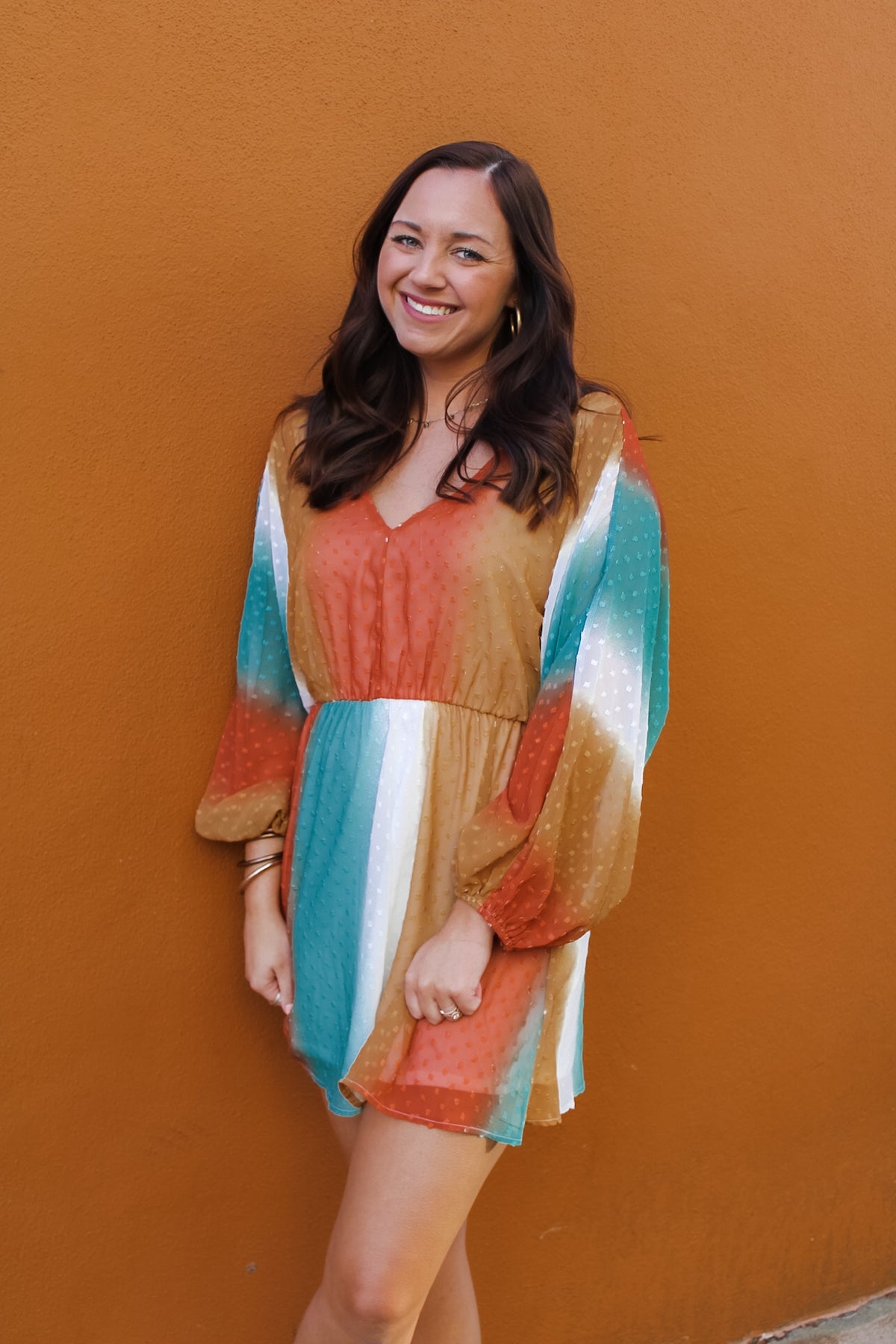 Our Free Bird dress is the perfect lightweight piece for the spring season. This piece brings burnt Orange, white, gold and turquoise together in a beautiful, unique pattern.