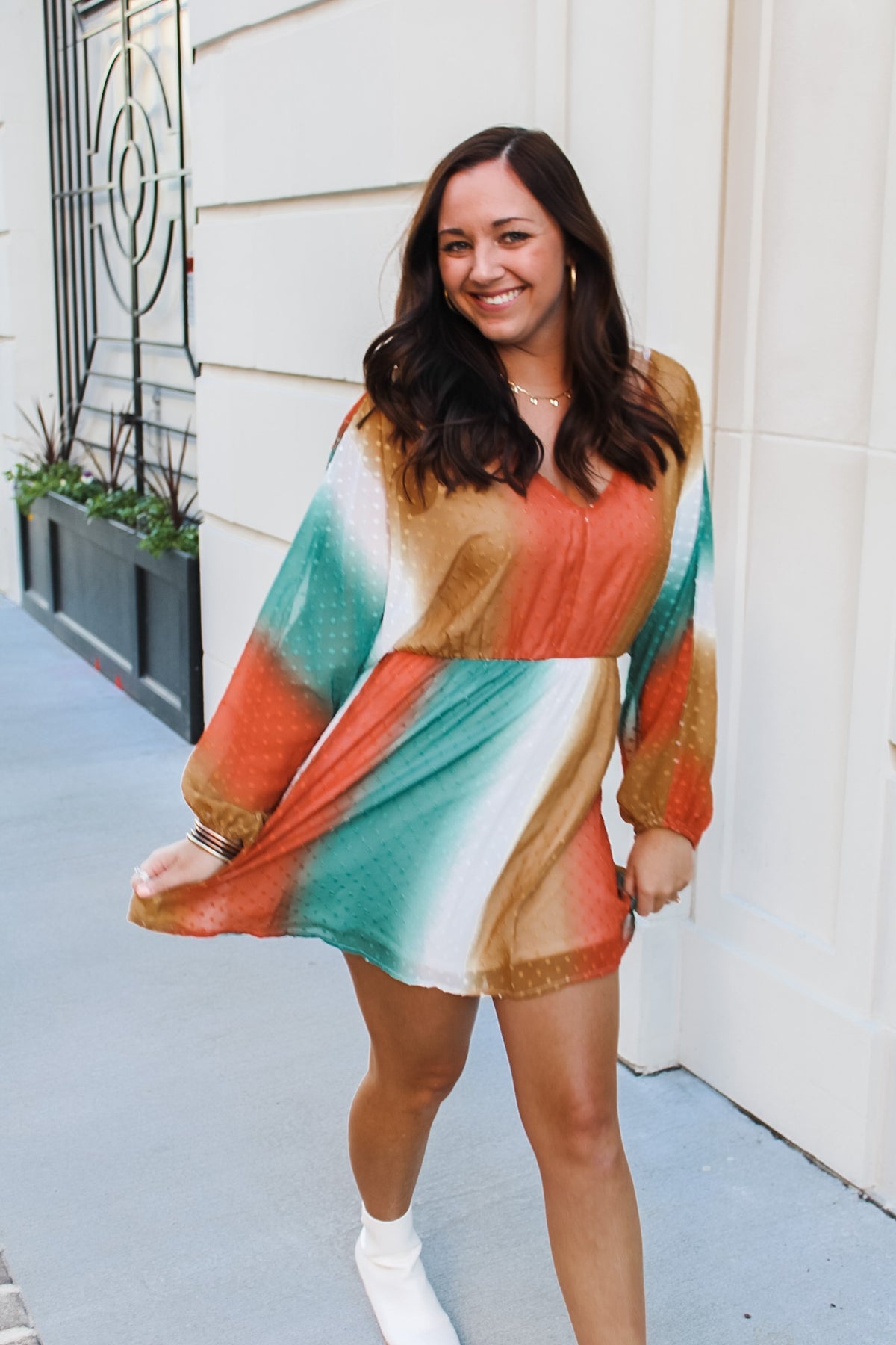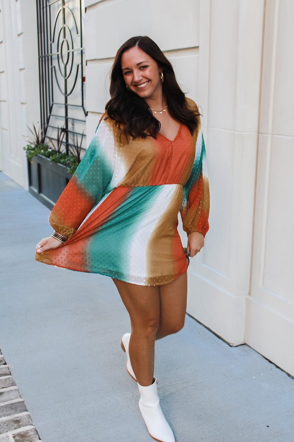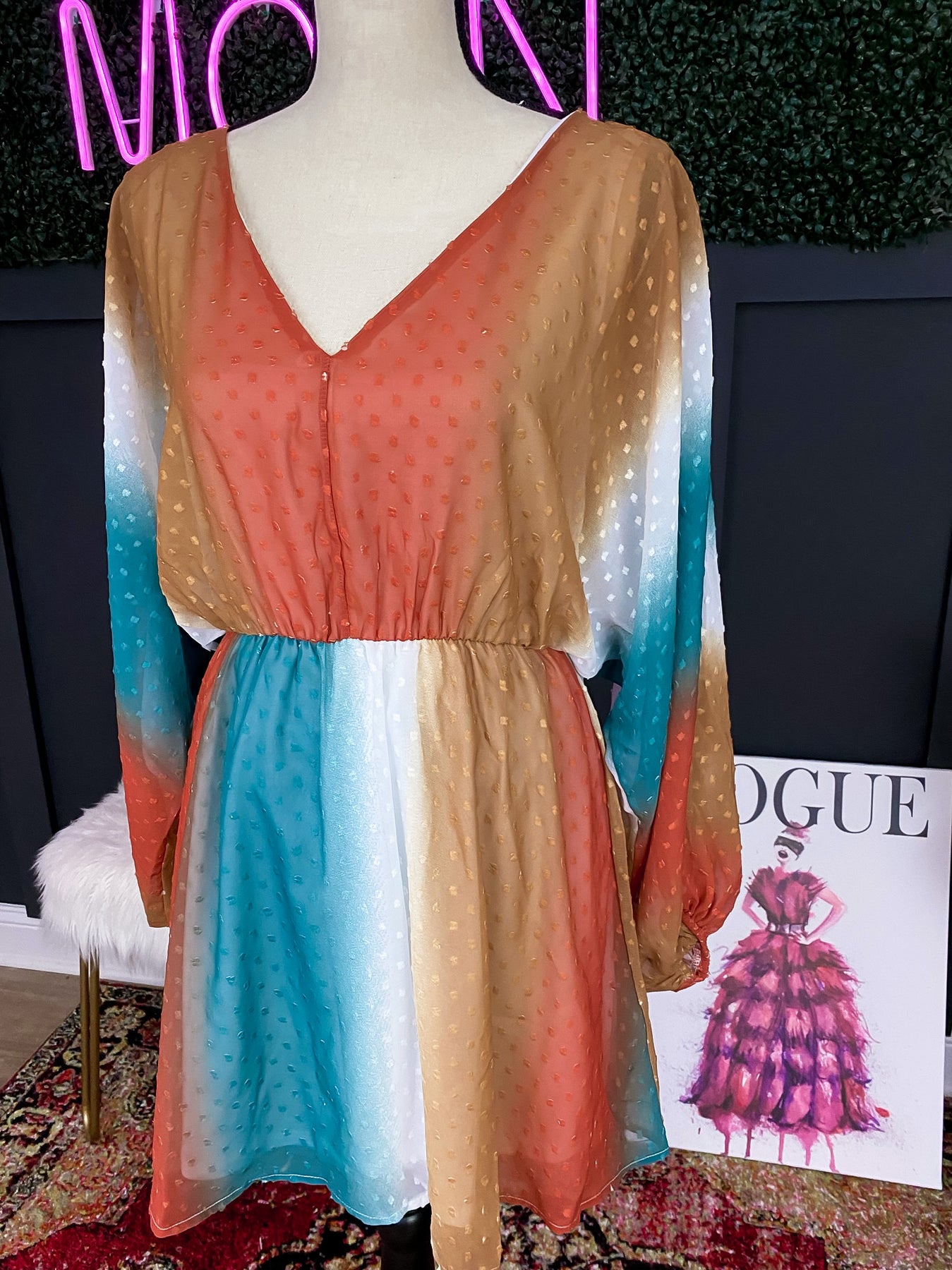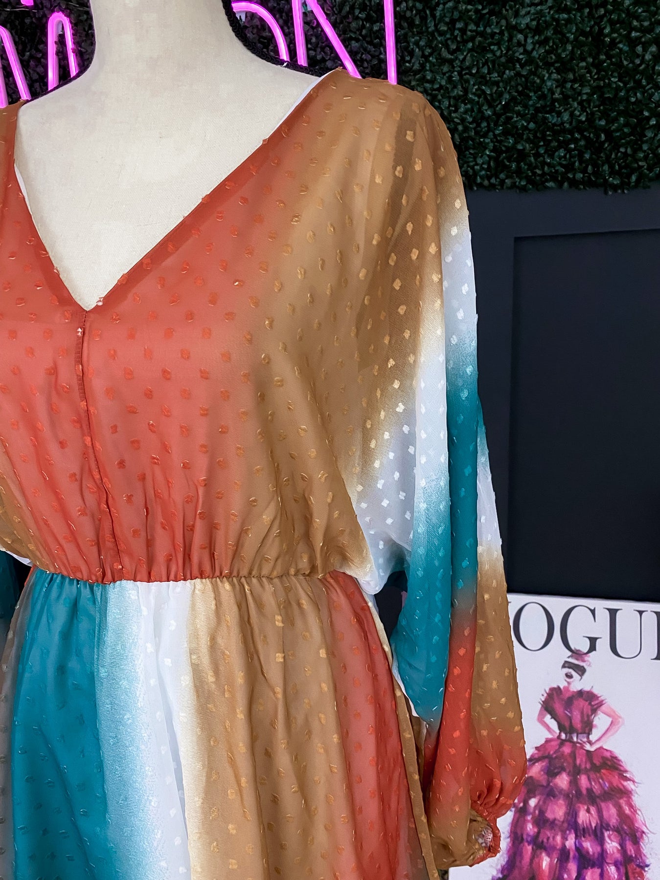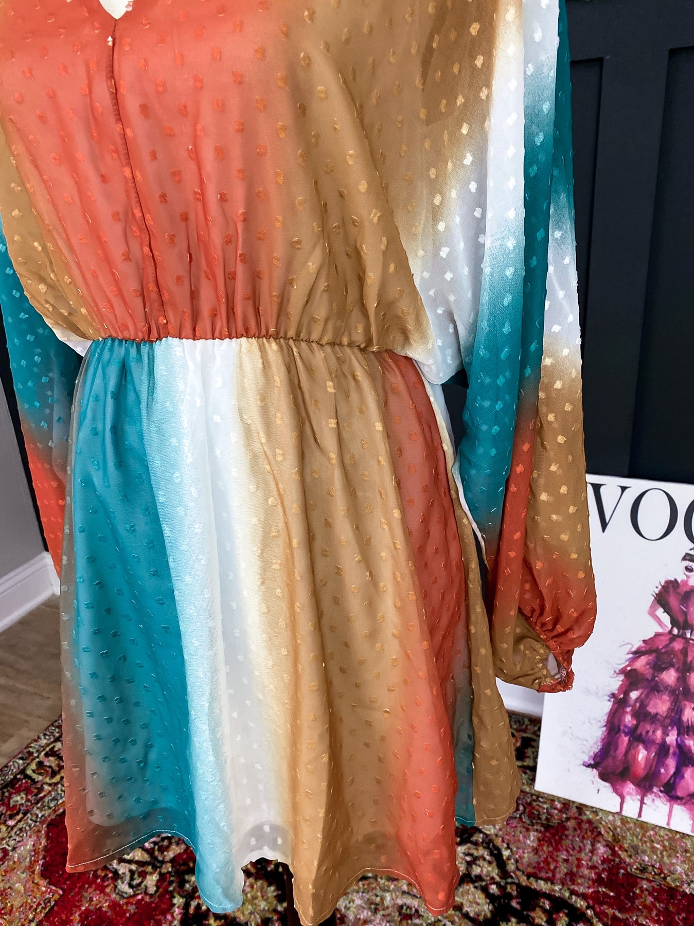 Our Free Bird dress is the perfect lightweight piece for the spring season. This piece brings burnt Orange, white, gold and turquoise together in a beautiful, unique pattern.