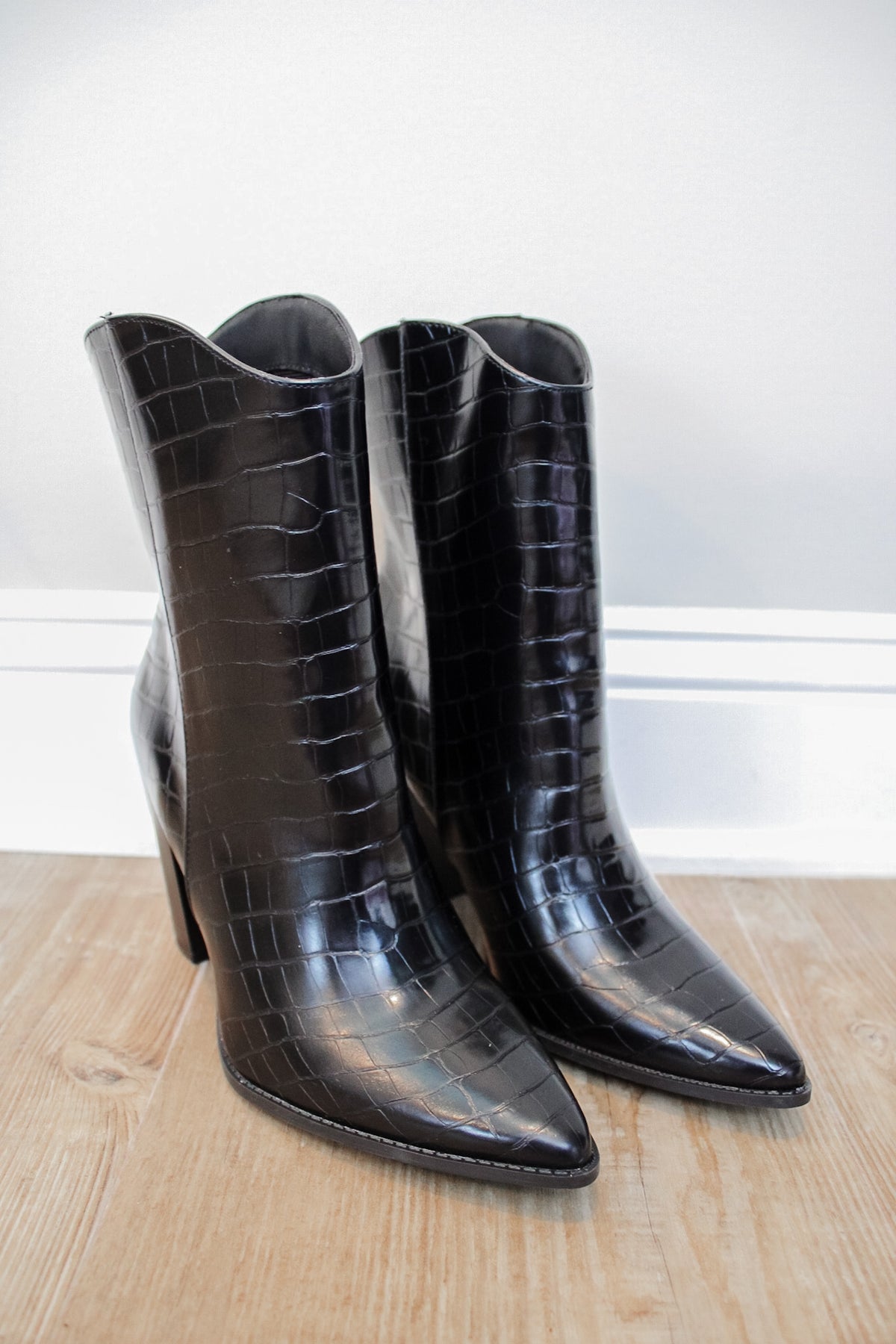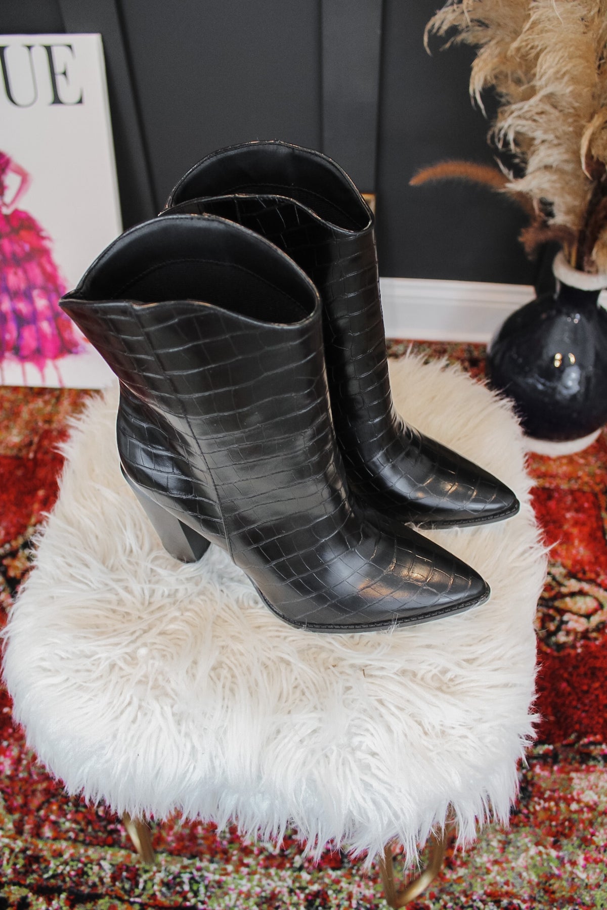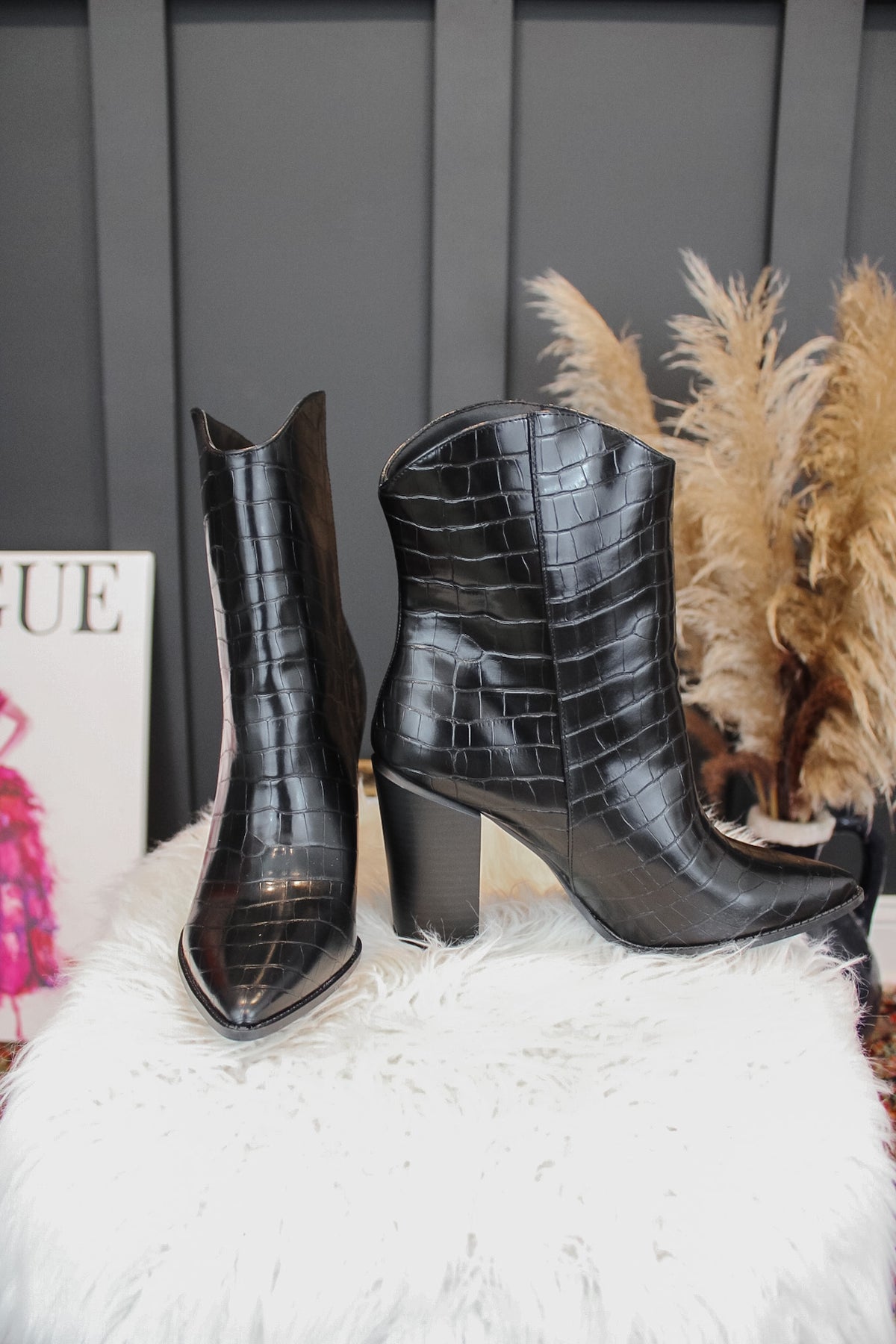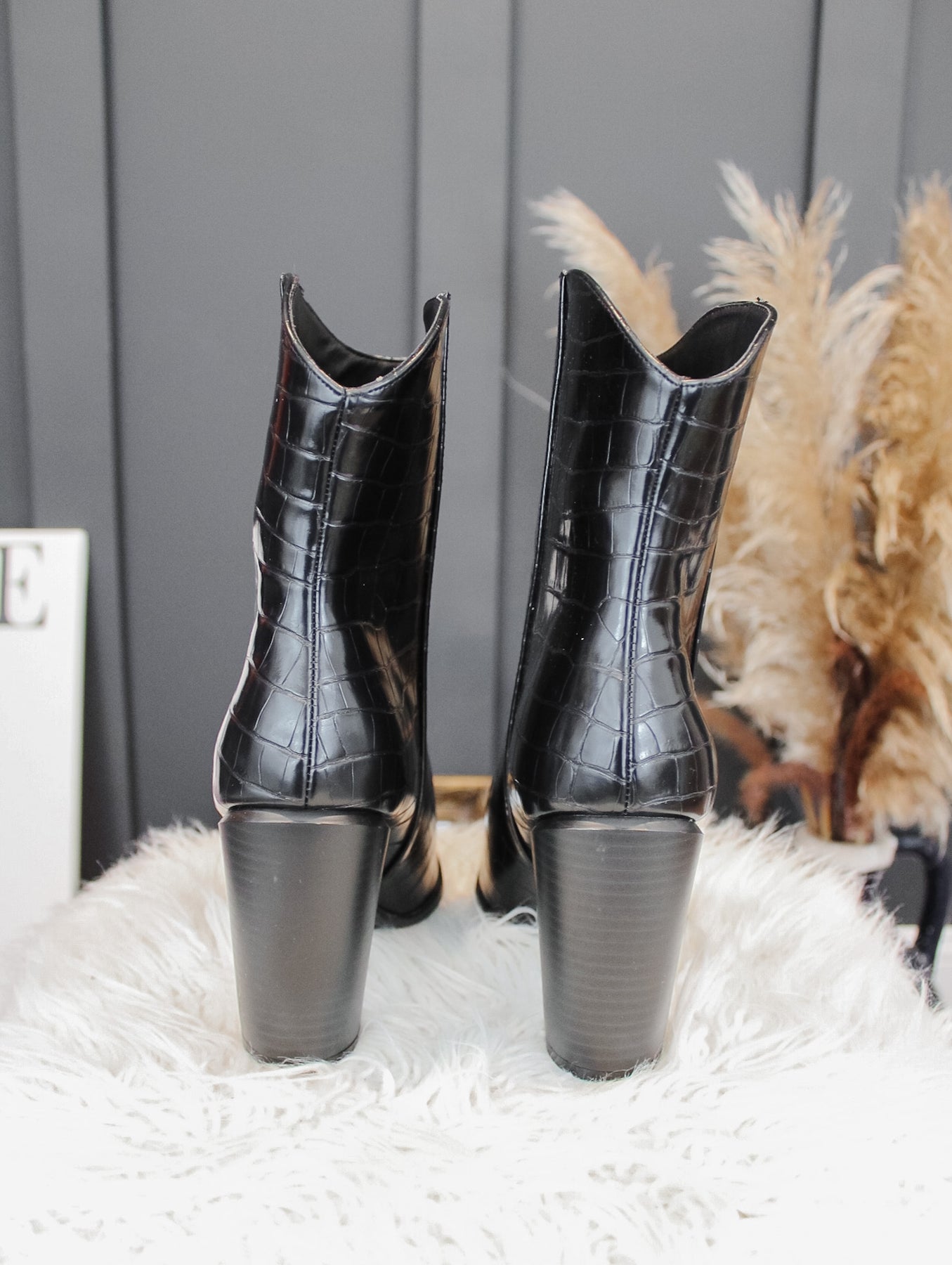 • Western faux crocodile booties. Easy to slide on. Fits above the ankle. 3 inch heel. Runs true to size.